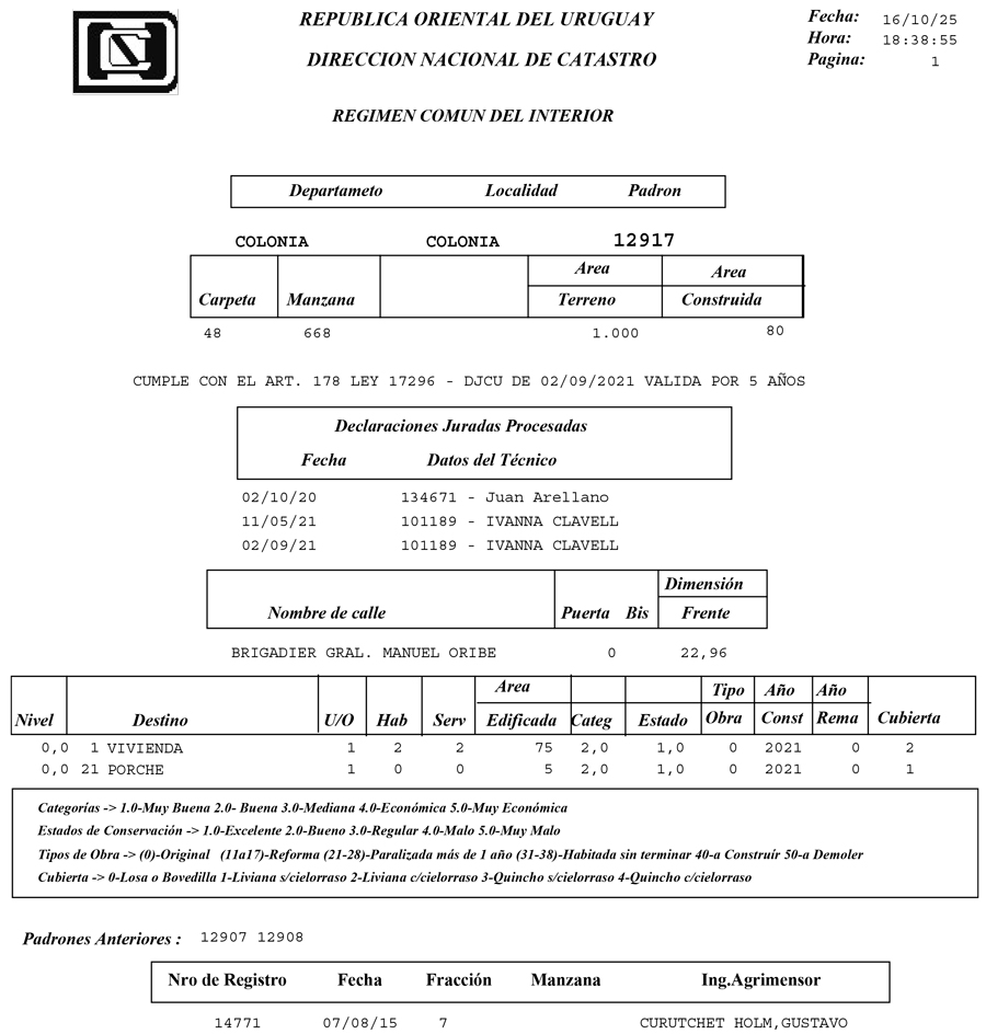 Solar de terreno con las mejoras que le acceden, sito Enel departamento de Colonia, localidad catastral Colonia, zona sub urbana, empadronado con en número DOCE MIL NOVECIENTO DIECISIETE (12.917), antes padrones 12907 y 12908 y antes padrones rurales números 23885 y 23886, el cual se señala como solar7 en el plano de mensura y fraccionamiento del Agrimensor Gustavo Curutcher Holm de abril del 2013, inscripto en la Dirección Nacional de Catastro, Oficina Delegada de Colonización el número 14771 el 7/8/2015, según el cual consta de una superficie de novecientos noventa y nueve metros cuadrados, noventa y tres decímetros cuadrados y se deslinda así: 22.96 metros de frente al Noroeste a la calle auxiliar existente; 44.74 metros al Noreste lindando con solar 8; 23.09 metros al Sur lindando con solares 29, 30, parte del 28 y parte del 31; y 42.35 metros al Suroeste lindando con el solar 6. Todos los solares del mismo plano citado.