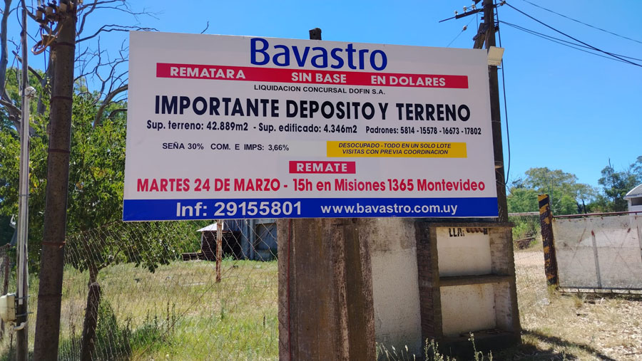 EDICTO. Se hace saber que en el concurso que tramita “DOFIN S.A.” ante el Juzgado Letrado de Primera Instancia de Concursos de Primer Turno, autos caratulados: “DOFIN S.A.-CONCURSO LEY 18.387”, ART. 11 VOLUNTARIO”, I.U.E 2-99777/2025, se dispuso por auto número 3088 de fecha 3 de noviembre de 2025, la liquidación de la referida sociedad, designándose Síndico a Liga de Defensa Comercial. La Sindicatura solicitó autorización para proceder a la venta privada de los bienes que componen la masa activa del concurso. Por auto número 3210/2025 del 11 de noviembre de 2025, el juzgado interviniente autorizó la venta privada. El remate se llevará a cabo a través del Rematador Héctor Bavastro, matrícula 2237, Rut 213384600012, el 24 de marzo de 2026 a la hora 15.00 en la calle Misiones número 1365 de esta ciudad. Entre los bienes que conforman la masa activa del concurso, se encuentran los siguientes bienes inmuebles: A) PLANTA INDUSTRIAL, que se compone de 6 padrones, a saber: I) Padrón número 62.636/004: Unidad de propiedad horizontal 004 que forma parte del edificio incorporado al régimen de propiedad horizontal al amparo de la Ley 14.261, modificativas y concordantes, en un terreno ubicado en el departamento de Montevideo, Localidad Catastral Montevideo, zona urbana, empadronado con el número 62.636, el que según plano de mensura y fraccionamiento del Agrimensor Antonio Asuaga Nogué de marzo de 1976, inscripto en la Dirección Nacional de Catastro el 12 de mayo del mismo año con el número 80466, cotejado por la División Propiedad Horizontal, el 3 de mayo de 1976, consta de una superficie de 579 metros 42 centímetros, con 20.65 metros al Sur de frente por ser esquina a Capitán Villademoros y 26.21 metros al Oeste también de frente por ser esquina a Avenida 8 de octubre. La citada unidad está empadronada individualmente con el número 62.636/004 y según el referido plano se ubica en Planta Baja a cota vertical mas 15 centímetros y consta de una superficie de 99 metros 8.499 centímetros y le corresponde el uso exclusivo de los bienes comunes patio “D”, azotea “J1” y depósito “PS1”. II) Padrón número 62.637: Terreno y edificio y mejoras que le acceden ubicado en el departamento de Montevideo, Localidad Catastral Montevideo, zona urbana, empadronado con el número 62.637, el que según plano de mensura y reparcelamiento del Agrimensor Alberto Benavidez Sosa de octubre de 1973, inscripto en la Dirección Nacional de Catastro el 2 de diciembre de 1974 con el número 76329, se señala como solar 4, consta de una superficie de 6.714 metros 22 centímetros y se deslinda así: al Noroeste 68.42 metros de frente a la Avenida 8 de Octubre estando señaladas sus puertas con los números 4518 al 4540, entre las calles Capitán Villademoros y Alférez Real; al Noreste, línea quebrada compuesta por dos tramos rectos que miden 21.46 metros y 91.28 metros lindando con los padrones 62.639 y 62.638; al Sureste 64.36 metros también de frente a la calle Andrés Latorre estando señaladas sus puertas con los números 4539 y 4527; al Suroeste línea quebrada compuesta por cuatro tramos rectos que miden 0.74 metros, 18.02 metros, 57.98 metros y 8.19 metros lindando el primero y el segundo con parte del solar 3 del mismo plano, el tercero con parte de los solares 3 y 2 del mismo plano y el cuarto con parte del solar 1 del mismo plano. III) Padrón número 62. 638: Terreno con edificio y demás mejoras que le acceden ubicado en el departamento de Montevideo, Localidad Catastral Montevideo, zona urbana, empadronado con el número 62.638, el que según plano del Agrimensor Roberto Schinka de mayo de 1955, inscripto en la Dirección Nacional de Catastro el 15 de noviembre de 1955 con el número 31433, se señala como solar C, consta de una superficie de 2.079 metros 20 centímetros y se deslinda asi: al Noreste 80.38 metros de frente a la calle Alférez Real; al Sureste 25.86 metros también de frente por ser esquina a la calle Andrés Latorre; al Suroeste 80.33 metros lindando con solar A del mismo plano hoy padron 62.637, al Noroeste 25.89 metros lindando con el solar B del mismo plano, hoy padrón 67.639. IV) Padrón 62.639/005: Unidad de propiedad horizontal 005, que forma parte del edificio construido de conformidad con las leyes 10.751, 14.261, modificativas y concordantes, en el solar de terreno padrón número 62.639, ubicado en la décimo primera Sección Judicial de Montevideo, zona urbana, el que según el plano del Agrimensor Alberto Benavidez Sosa de octubre de 1975, cotejado por la División de Propiedad Horizontal de la Dirección General de Catastro e inscripto el 27 de noviembre del citado año, con el número 79420, consta de un área de 970 metros 84 decímteros con 31 metros 82 centimetros de frente al oeste a la Avenida 8 de Octubre. La unidad 005, padron individual 62639/005, se ubica en planta baja a cota vertical más 0,3 metros y tiene una superficie de 60 metros 6 decímetros, y le corresponde el uso exclusivo del Patio “D” (bien común) y la cuota parte en el terreno y demás bienes comunes conforme al plano citado y al Reglamento de Copropiedad. V) Padrón número 408.475/001: Unidad de propiedad horizontal 001, padrón 408.475/001, ubicado a cota vertical más 12 centimetros, con una superficie de 79 metros 850 centímetros, del edificio incorporado al regimen de propiedad horizontal de acuerdo a la Ley 10.751, 14.261 y al plano de fracionamiento del Agrimensor Antonio Asuaga Nogué de marzo de 1976, inscripto en la Dirección General de Catastro Nacional, con el número 80465, el 12 de mayo de 1976. Dicho edificio fue construido en un solar de terreno ubicado en la Localidad Catastral Montevideo, zona urbana, empadronado con el número 408475 y que según el plano citado tiene una superficie de 564 metros 9 decimetros que se deslindan así: 26 metros 60 centímetros al sur de frente a la calle Capitán Villademoros, distando el punto má