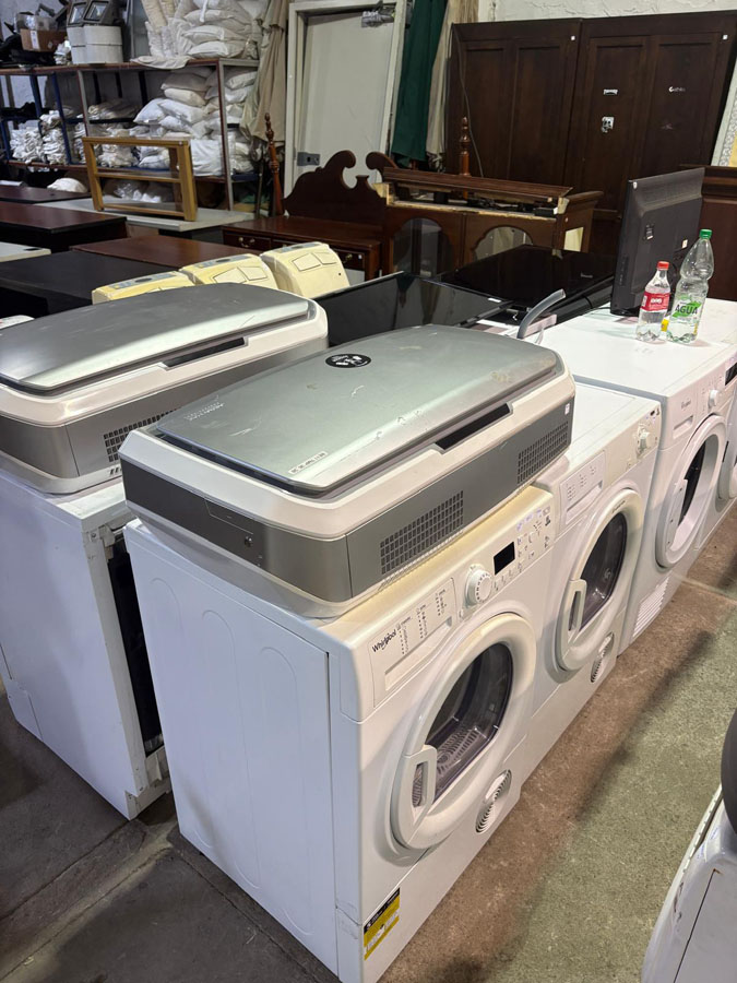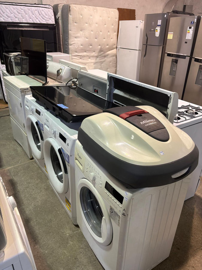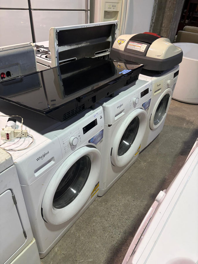 Heladeras Whirlpool, Samsung, Fagor. Lavarropas, secarropas y lavavajillas Whirlpool y Ariston, cocinas GE, estufas, hongos a gas. TVs, aires acondicionados, purificadores de aire, máquinas de cortar pasto a nafta y batería, cortadora de cerco.